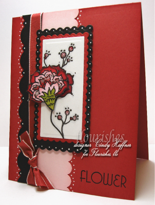Cindy Haffner's creation has the word bold and beautiful written all over it. I love the black and red with the contrast of the light pink and white. The dots add a bit of punch and how she layered the flower from the Floral Fantasy set is just lovely! It all adds up to one very pretty card! For more on Cindy's creation, visit her little corner of the blogosphere HERE.